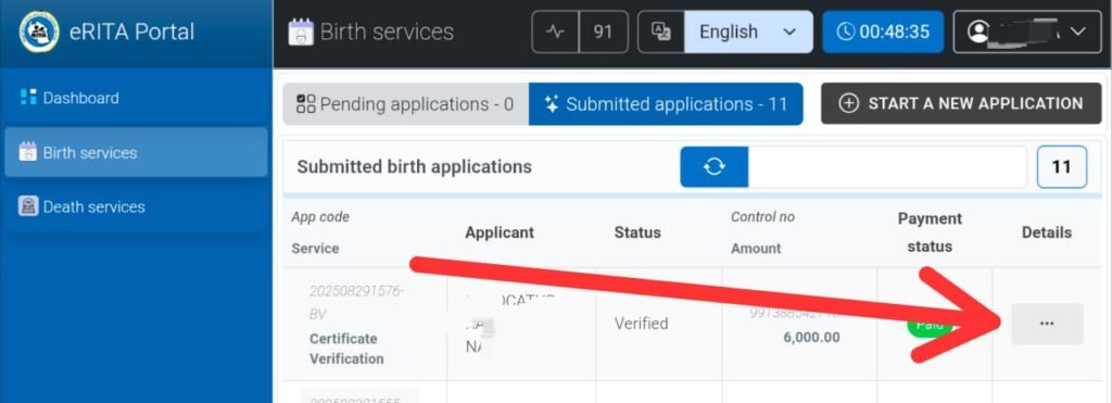 After click print you will get your information as shown below, that arrow shows your Application code which is your RITA Birth Certificate Verification number that you will use to apply for loan.